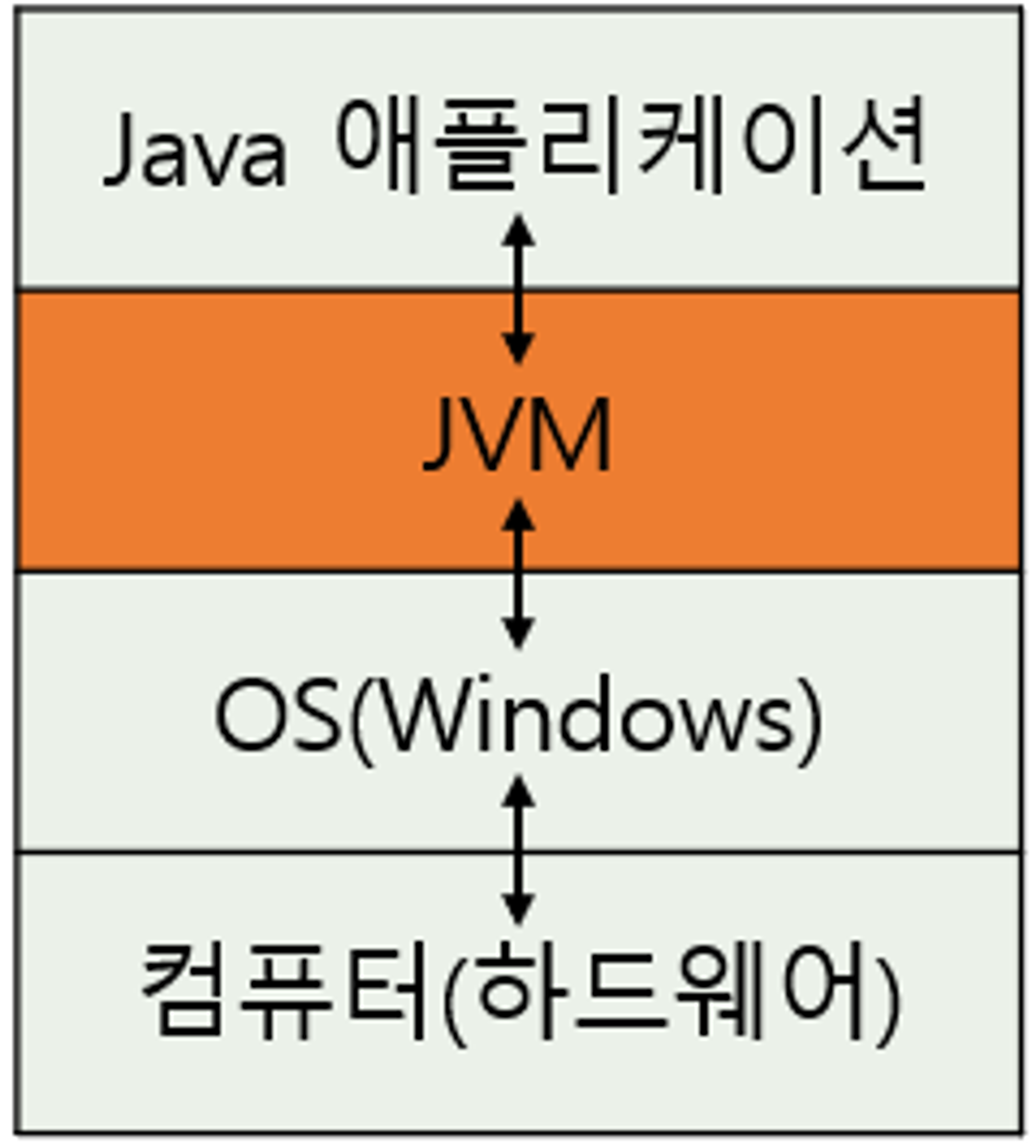 그 이유는 자바는 JVM(Java Virtual Machine)이라는 가상머신 위에서 실행되기 때문이다. 우리가 작성하는 소스 코드를 컴퓨터가 이해할 수 있는 기계어로 곧바로 컴파일하는 C/C++관련 컴파일러와 달리, 자바 컴파일러(Java Compiler)는 자바 코드를 기계어로 직접 컴파일하는 것이 아니라 자바 바이트 코드(Java Byte Code; 클래스(.class) 파일)라는 특수한 바이너리 코드로 우선 변환한다. 그리고 JVM이 설치될 수 있는 다양한 시스템에서 JVM을 이용해 이 자바 바이트 코드를 실행하면, JVM이 자바 바이트 코드를 기계어로 번역하고 메모리에 올린 뒤 실행하게 된다.
