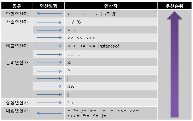 3. 단항 연산자와 대입 연산자를 제외한 모든 연산의 진행방향은 왼쪽에서 오른쪽이다.