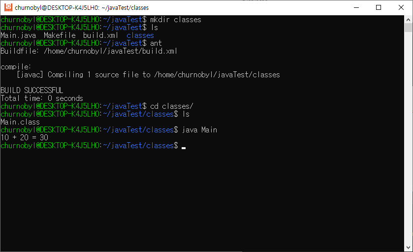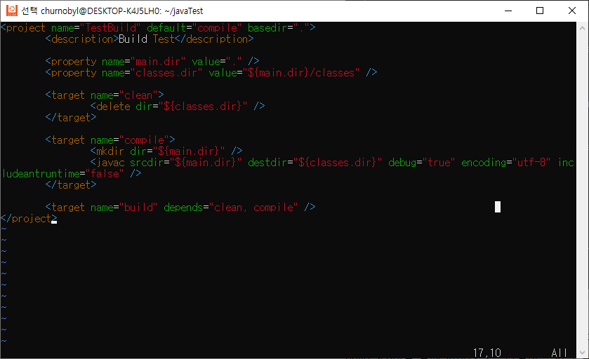 xml로 빌드 관련 설정들을 해주었다. 우리는 Main.java에 추가적인 클래스들을 임포트하지 않으므로 관련 설정들은 다 빼고 아주 기본적인 것들만 설정해주었다. property같은 경우는 Maven의 pom.xml처럼 변수를 설정할 때 사용된다. main.dir변수는 현재 폴더, class파일을 생성할 폴더는 classes.dir변수로 설정해주었다. 그리고 컴파일한 class파일은 classes 폴더에 생성되게끔 설정해주었다.