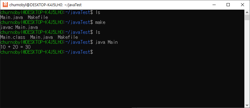 다음과 같이 make 명령어를 실행했고 Main.class파일이 만들어졌다. 그리고 실행도 잘 된다.