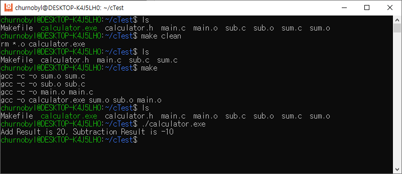 gcc 컴파일러를 이용해 main.c, sum.c, sub.c 파일을 각각 object파일로 컴파일했다. 이제 각 object파일들을 링킹해서 실행 가능한 calculator.exe파일로 만들고 실행했더니 다음과 같이 실행결과가 출력됐다.