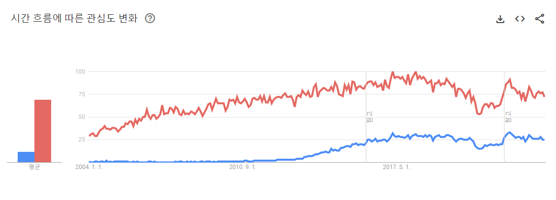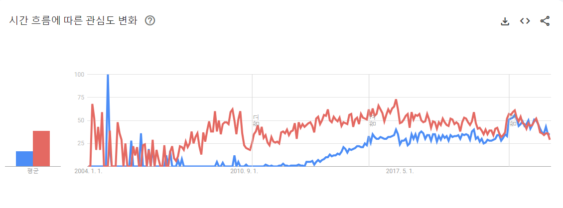 자바를 빌드할 때 여러 가지 빌드 도구들을 사용할 수 있다. 현재는 Maven과 Gradle을 대표적으로 많이 사용한다. '둘 중 어느 것을 사용하는 것이 좋을까'에 대한 궁금증을 해소하기 위해 Google Trends를 이용해 두 단어의 검색량 추이를 비교해봤다. 절대적인 수치는 아니지만 사람들의 관심도를 통해 간접적으로 위 질문에 대한 해답을 얻을 수 있을 것 같다.