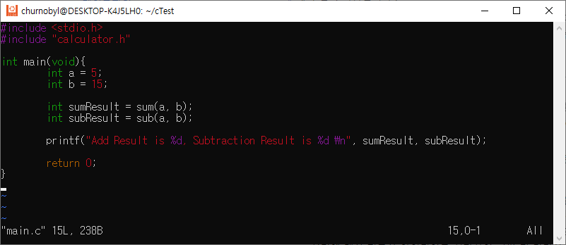 c언어를 잘 모르기 때문에 기본적인 지식만을 이용해 간단한 main.c 코드를 작성했다. int형 변수 a, b를 받아서 덧셈, 뺄셈 함수인 sum(), sub() 함수를 통해 덧셈, 뺄셈 결과를 출력하는 아주 간단한 코드다. 이 때, 두 함수는 헤더파일 calculator.h에 정의되어 있다. 따라서 calculator.h를 작성하자.