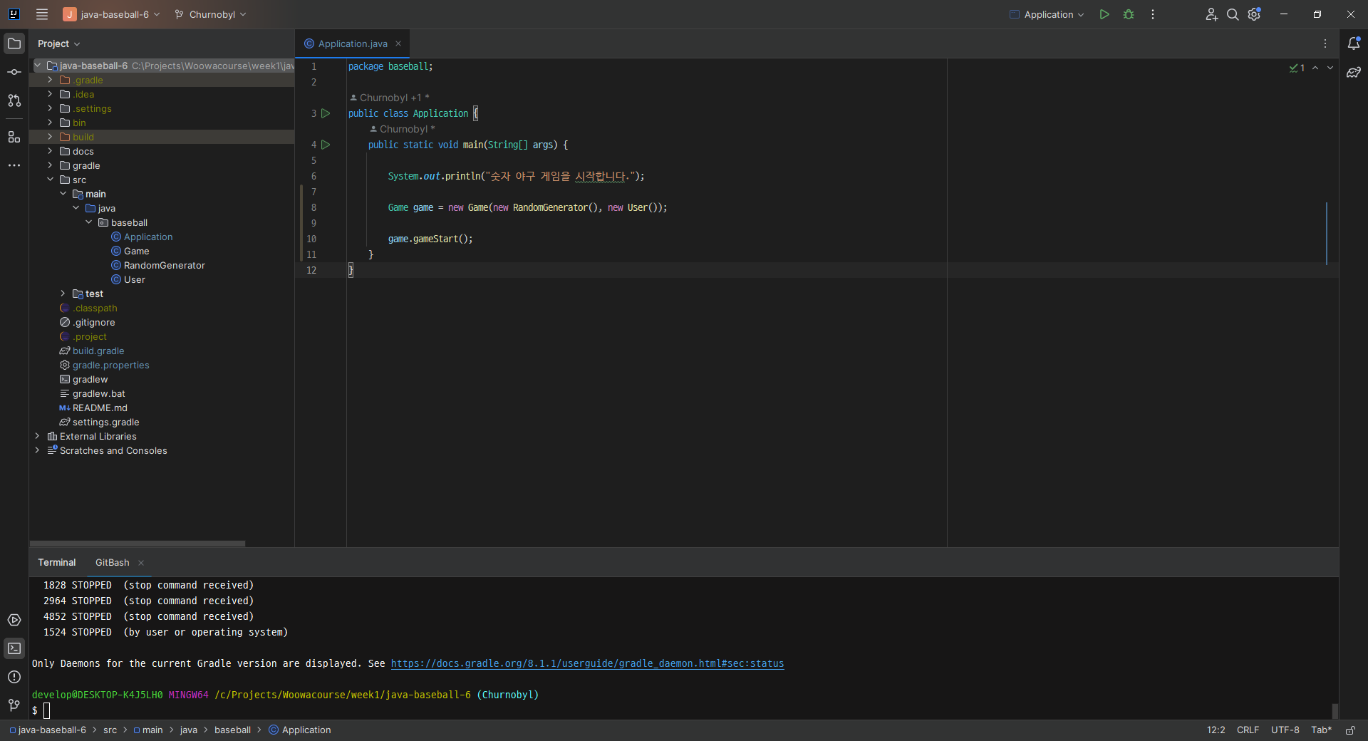 이번 과제로 배운 점이 많았다. 과제를 클론하니 우테코에서는 빌드 관리 툴로 Gradle을 사용하는 걸 알았는데, Gradle이 뭔지도 잘 몰라서 어떻게 해야할 지 감도 안 잡혔다. 처음에는 그냥 gradlew로 실행하면 빌드가 된다고 해서 그 기능만 사용해서 과제를 제출했는데 이후 자바의 빌드 관리 툴을 공부하면서 왜 Gradle이 기존 빌드 툴에 비해서 장점이 많은지도 알게 되었고, 어떤 식으로 빌드가 진행되는지도 알게 되었다. 또 파이썬 코드를 작성할 때는 그냥 클래스 하나에다가 메소드를 몰빵하는 식으로 코드를 작성하기도 했었는데, 자바 컨벤션은 각 파일당 한 클래스씩 유지보수가 용이하게끔 작성하는게 디폴트였다. 확실히 기능별로 파일을 나눠서 하나의 클래스만을 작성하니 유지보수도 편하고 진짜 모듈을 다루는 느낌이 들었다.