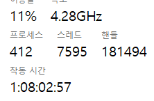 작업관리자에서 CPU 작동 시간을 봐도 1일 + 8시간 = 32시간으로 딱 맞는 것을 볼 수 있다.