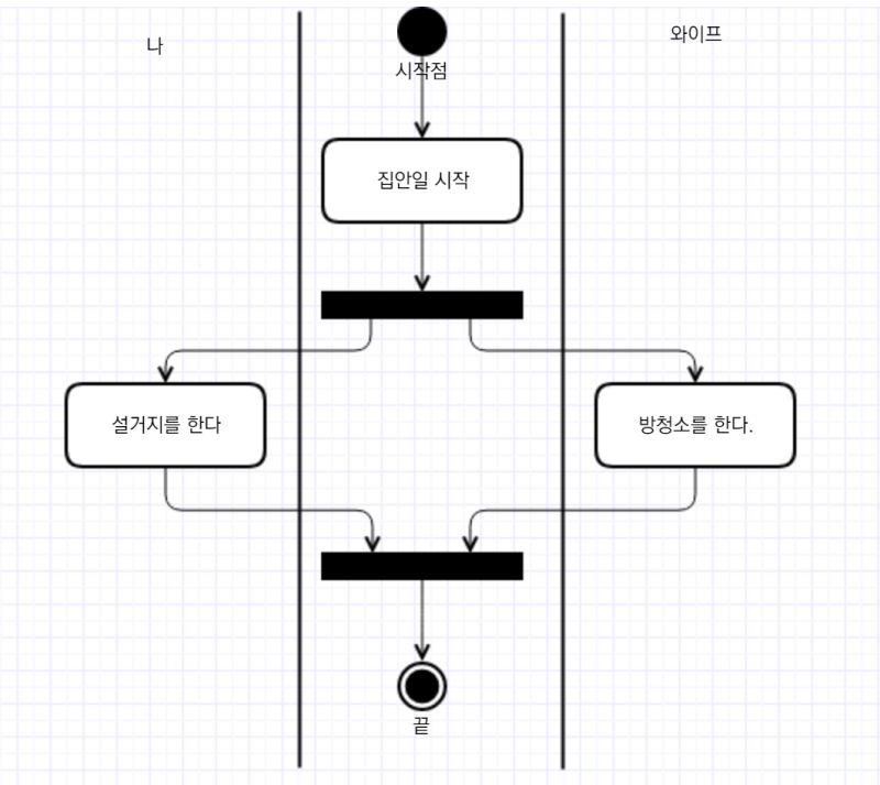 - 활동 다이어그램은 사용자의 관점에서 시스템이 수행하는 기능을 처리 흐름에 따라 순서대로 표현한 것이다.