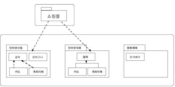 - 패키지와 패키지, 패키지와 객체 간을 점선 화살표로 연결하여 표현함