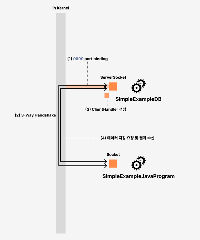 (1) 서버를 모사한 SimpleExampleDB는 데이터를 수신할 ServerSocket을 만들고 9990 포트에 바인딩한다. (2) 이제 클라이언트를 모사한 SimpleExampleJavaProgram은 Socket을 만들고 두 프로세스 간의 논리적인 접속을 성립(establish)하기 위해 9990포트의 프로세스와 3-Way Handshake를 수행한다. (3) 서로 간의 논리적인 접속이 확인됐다면 SimpleExampleDB는 해당 클라이언트와 연결을 유지하기 위해 새로운 쓰레드인 ClientHandler를 생성하고 클라이언트로부터 수신을 기다린다. (4) 클라이언트인 SimpleExampleJavaProgram은 DB를 향해 전하고자 하는 메시지(여기서는 'DB야! memberA를 저장해줘')를 던지고, DB는 해당 메시지를 수신한 뒤 적절한 로직을 수행하고 다시 클라이언트에게 메시지를 전달한다.