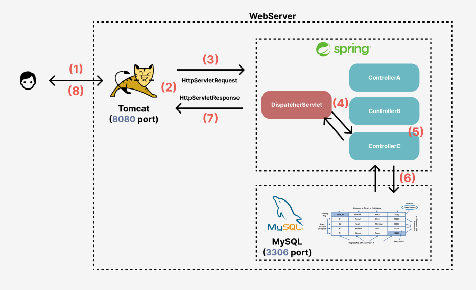 (1) Tomcat이 열려있는 웹서버 포트에 유저의 요청이 도착하면 (2) Tomcat은 HttpServletRequest와 HttpServletResponse객체를 생성하고 (3) Spring의 DispatcherServlet에 요청을 전달한다. (4) DispatcherServlet은 요청을 적절한 컨트롤러로 전달하고 (5) 요청을 전달받은 컨트롤러는 요청을 처리하기 위해 Service 계층과 상호 작용해 비지니스 로직을 수행하고 반환할 모델 데이터를 준비한다. (6) 이때 MySQL과 상호 작용이 필요하다면 MySQL이 열려있는 포트에 접속을 요청하고 작업을 수행한다. (7) 그리고 최종적인 결과를 다시 DispacherServlet이 적절한 형식으로 변환해 HttpServletResponse객체에 기록한 뒤 (8) Tomcat이 최종적으로 응답을 반환한다.