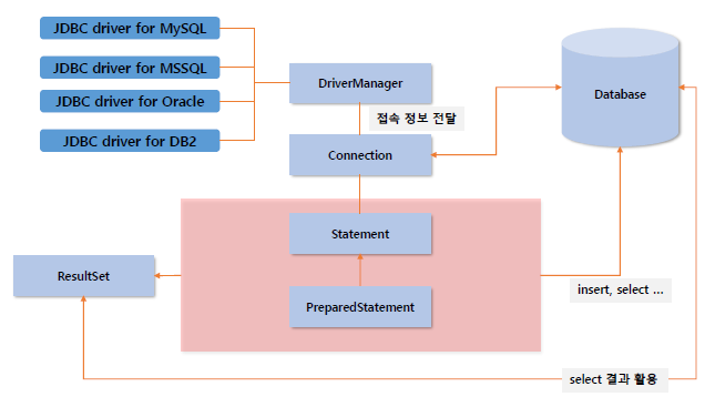 위의 그림에서 보이는 인터페이스들을 간단히 설명하면, DriverManager는 각 벤더의 Driver 구현체를 등록하고 Driver로부터 DB와 전체적인 연결을 유지하는 Connection 인터페이스를 획득한다.