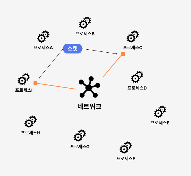 자바 프로그램이나 데이터베이스와 같은 프로세스가 데이터를 프로세스 바깥으로 내보내거나 받기 위해서는 소켓(Socket)이 필요하다. 소켓이란 일반적인 정의로 A파이프의 끝과 B파이프의 끝을 연결하기 위한 이음새를 말한다. 쉽게 말해, 어떤 다른 두 물체를 연결하기 위한 접점을 말한다. 이 정의를 네트워크 분야에서의 의미로 확장해보자. 네트워크 소켓(Network socket)은 컴퓨터 네트워크를 경유하는 프로세스 간 통신의 종착점이다. 즉 A 프로세스와 B 프로세스가 통신하기 위해서는 네트워크(파이프)를 거쳐야 하는데, 이 때 A, B프로세스가 네트워크에 연결하기 위한 각각의 통신 접점이 소켓이다.