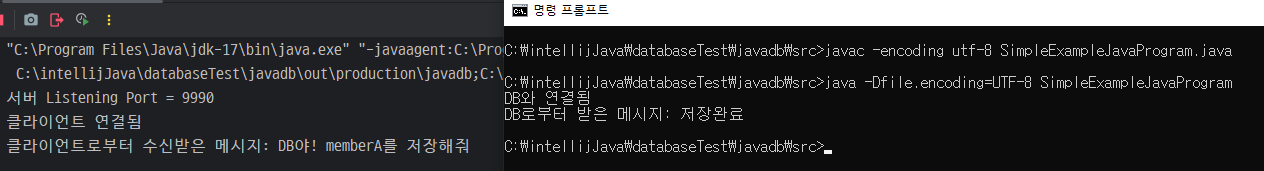 간략한 예제지만 이는 자바와 데이터베이스가 통신하는 과정을 전체적으로 나타낸다. 메시지가 'DB야! memberA를 저장해줘'가 아니라 DB가 이해할 수 있는 메시지라면 DB는 적절한 로직을 수행해 자바 프로그램에게 적절한 결과를 전달해 줄 것이다.