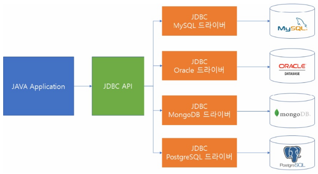 이때부터 각 데이터베이스 벤더들은 Java의 기준인 JDBC 인터페이스를 자기들의 제품에 맞게 구현한 JDBC Driver를 만들었다. 이로써 각 벤더의 JDBC Driver 구현체는 전부 다르게 생겼지만 연결 방법이 통일되어 개발자들은 해당 제품에서 제공하는 JDBC Driver를 자바 코드에 추가만 해도 같은 코드로 데이터베이스와 연결할 수 있게 되었다.
