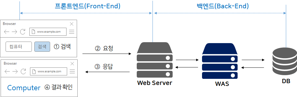 자바를 베이스로 한 웹 어플리케이션을 포함한 모든 언어의 웹 어플리케이션의 대략적인 구조는 다음과 같다. 먼저 유저가 웹사이트에 접근해 정보를 요청하면 웹 서버에 탑재된 WAS(Web Application Server)는 응답을 주는데, 이 때 해당 요청이 DB 데이터를 필요로 하거나 데이터를 저장해야 한다면 DB에 접근한다.