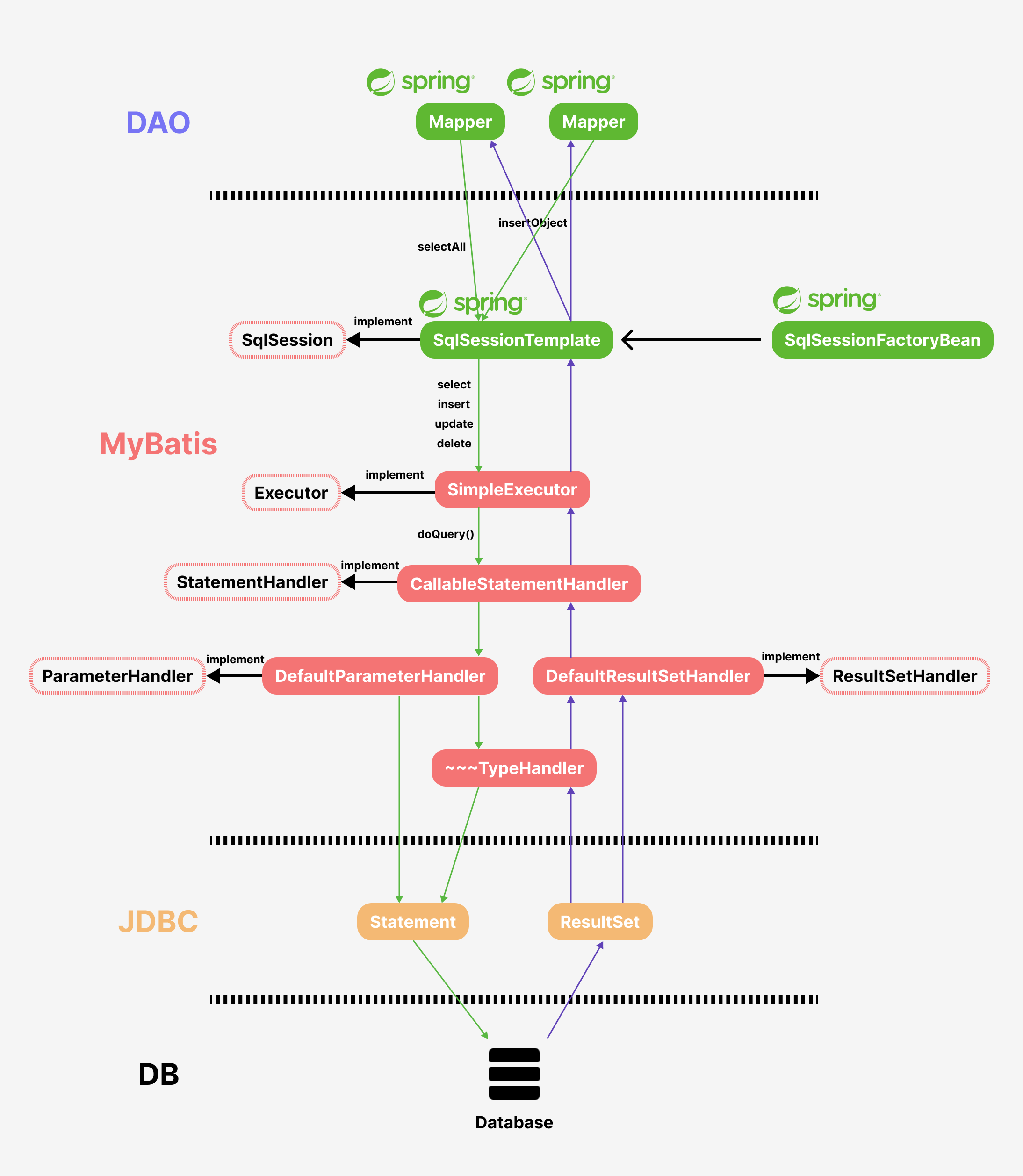 MyBatis가 스프링을 만나면 훨씬 더 강력해진다. 우선 첫번째. DB와 상호작용이 필요할 때 SqlSessionFactory로부터 SqlSession을 만드는 과정을 스프링이 대신해준다. 두번째. SqlSession에서 매핑된 SQL 쿼리를 가져와서 자바 인터페이스로 활용하는 과정도 스프링이 대신해준다. 즉, 자바 인터페이스가 스프링 빈으로 등록되어 있기 때문에 그냥 필요한 곳에 가져와서 쓰기만 하면 된다. 아래 그림을 보자.