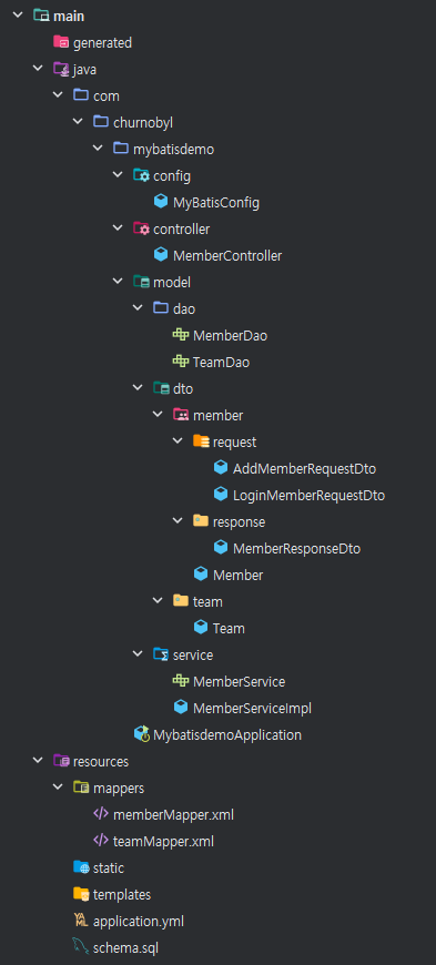 Spring boot에서 의존성으로 MyBatis Framework와 H2 Database, Lombok을 추가시켜 주었다. 전체적인 프로젝트 구조는 다음과 같다.