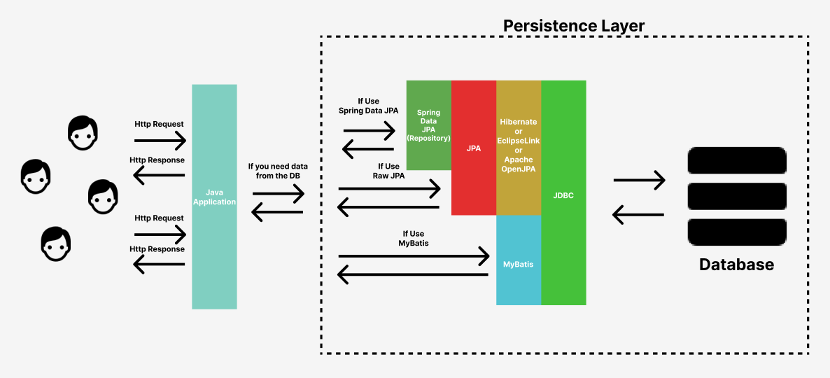 MyBatis가 스프링을 만나면 훨씬 더 강력해진다. 우선 첫번째. DB와 상호작용이 필요할 때 SqlSessionFactory로부터 SqlSession을 만드는 과정을 스프링이 대신해준다. 두번째. SqlSession에서 매핑된 SQL 쿼리를 가져와서 자바 인터페이스로 활용하는 과정도 스프링이 대신해준다. 즉, 자바 인터페이스가 스프링 빈으로 등록되어 있기 때문에 그냥 필요한 곳에 가져와서 쓰기만 하면 된다. 아래 그림을 보자.