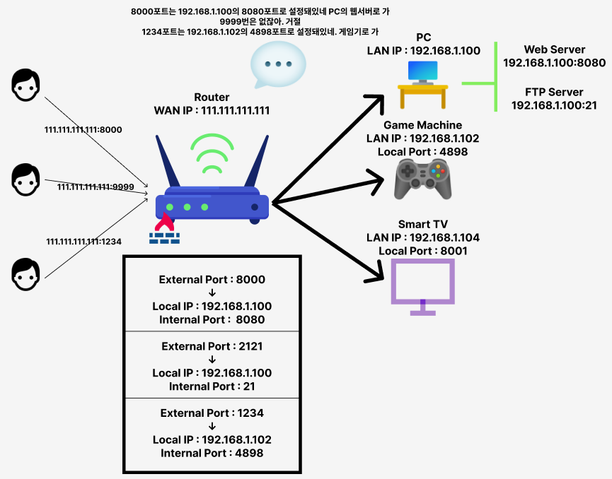 일반적으로 포트 포워딩은 컴퓨터 네트워크에서 패킷이 라우터나 방화벽 같은 네트워크 게이트웨이를 통과하는 동안 네트워크 주소를 변환해 트래픽을 리디렉션하는 것을 의미한다. 즉 OSI 7계층 모델에서 세번째 계층인 네트워크 계층(Layer 3)에서 사용된다. 그리고 이러한 포트 포워딩은 외부 네트워크의 사용자가 개인 네트워크의 서비스에 액세스할 수 있도록 하는 데 사용된다.