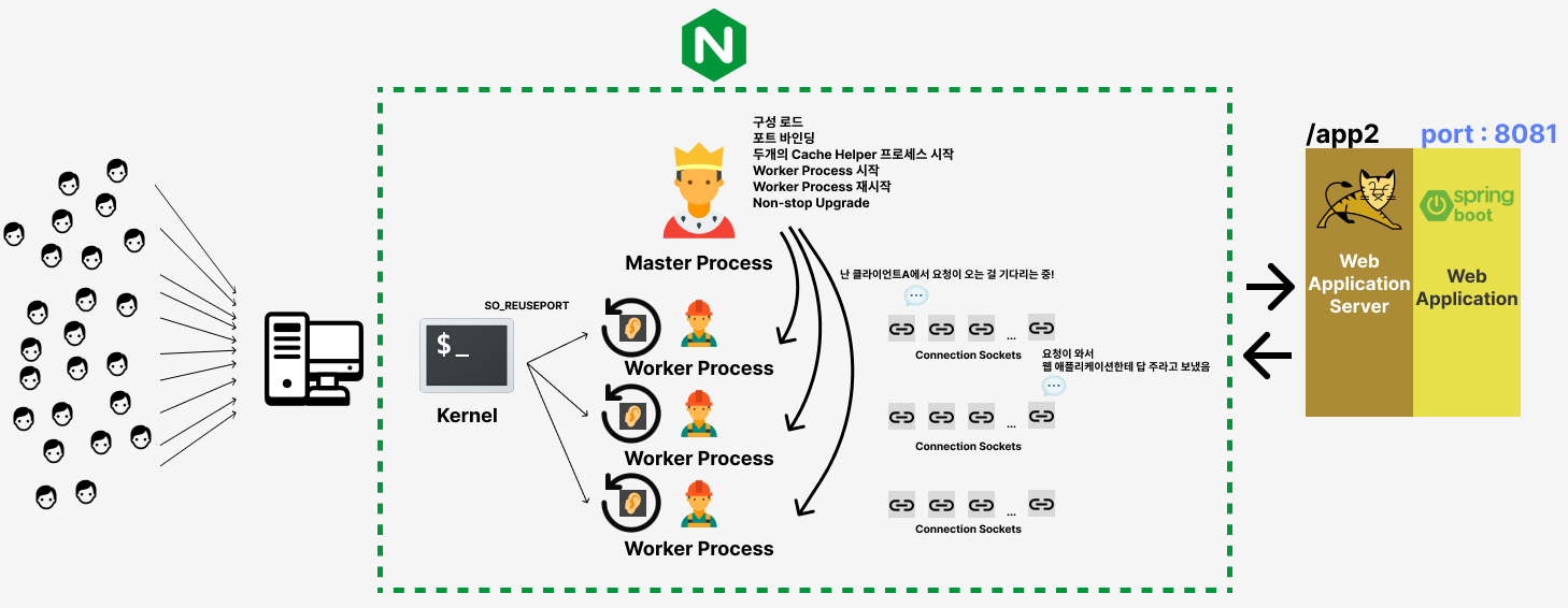 Worker Process는 생성될 때 Master Process로부터 Listen Socket 세트를 함께 제공 받는다. Worker Process 왼쪽의 귀 모양이 Listen Socket이며, 커널로부터 이벤트를 기다린다. nginx는 여러 Worker Process로 부하를 분산하기 위해 커널 특히, Unix 계열 OS 커널의 SO_REUSERPORT 옵션을 사용하는데, 이 옵션을 이용한 nginx에서 Socket Sharding라고 부르는 이 기술은 같은 포트로 들어오는 워크로드를 여러 프로세스로 분산시킬 수 있다. 리눅스 커널의 도움을 받아 클라이언트로부터 들어오는 요청이 여러 Worker Process로 분산돼 들어오면 Worker Process의 Listen Socket은 각 클라이언트의 요청마다 Connection Socket을 만든다. Connection Socket은 각각 Non-blocking I/O 방식으로 해당 클라이언트로부터 요청을 기다리고 Worker Process는 수많은 Connection Socket 중에서 요청이 온 클라이언트만 처리하면 된다. 따라서 특정 클라이언트의 요청이 올 때까지 기다릴 필요가 없다.