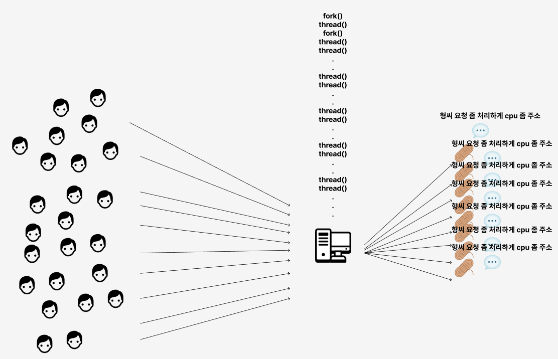 앞서 말한 것처럼 당시 Apache HTTPd의 작동 방식은 클라이언트가 접속 요청을 할 때마다 새로운 프로세스나 쓰레드를 생성하는 것이다. 그리고 우리가 알다시피 이러한 운영은 CPU와 메모리 자원의 낭비가 크다. thread() 명령을 통해 새로운 쓰레드를 생성할 때마다 각 쓰레드는 별도의 메모리 스택을 가지므로 한 개의 쓰레드가 1MB만 차지한다고 해도 10,000명의 요청을 동시에 처리하기 위해서는 최소 10GB의 메모리가 필요하다. 만약 돈을 빵빵하게 써서 메모리가 넉넉해, 1만개의 쓰레드를 생성해도 문제가 전혀 없다고 하더라도, 이제는 경합 조건(Racing Condition)문제가 대두된다. 한정된 CPU 자원을 차지하기 위한 경쟁에 1만개의 쓰레드가 참여한다면 정신이 나가버릴 것이다.