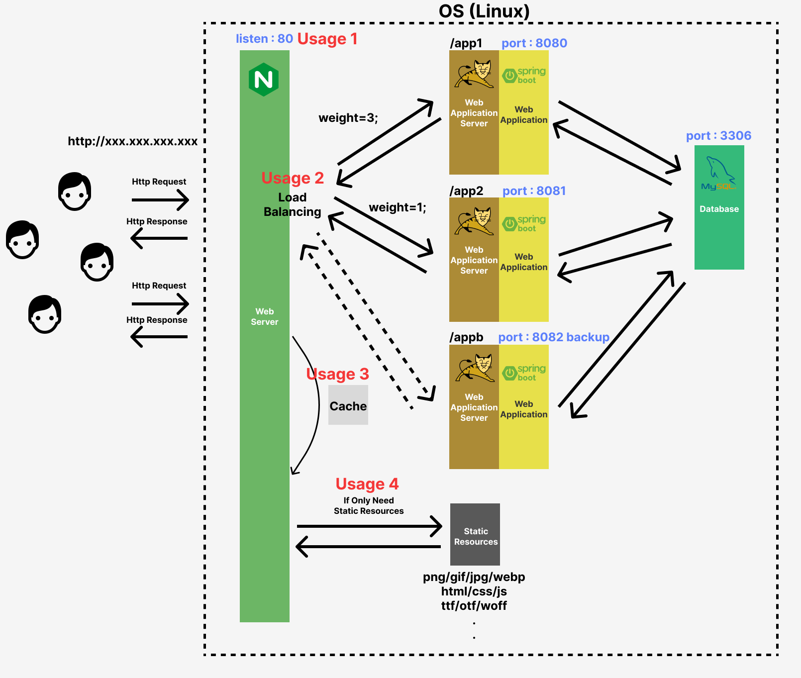 nginx는 수많은 클라이언트와 서버의 연결을 원활하게 하는 역할 뿐만 아니라 추가적인 개발을 통해 서버단의 최전방에서 더 많은 역할을 수행한다. 위의 그림의 Usage를 요약하면 다음과 같다.