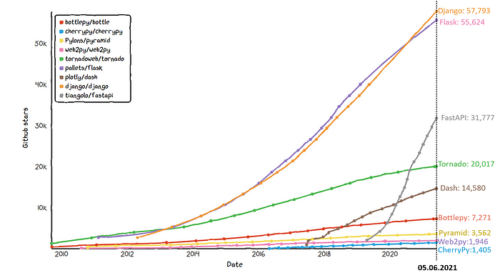 Django는 2021년 Github star 기준 가장 많은 star수를 가진 프레임워크다.