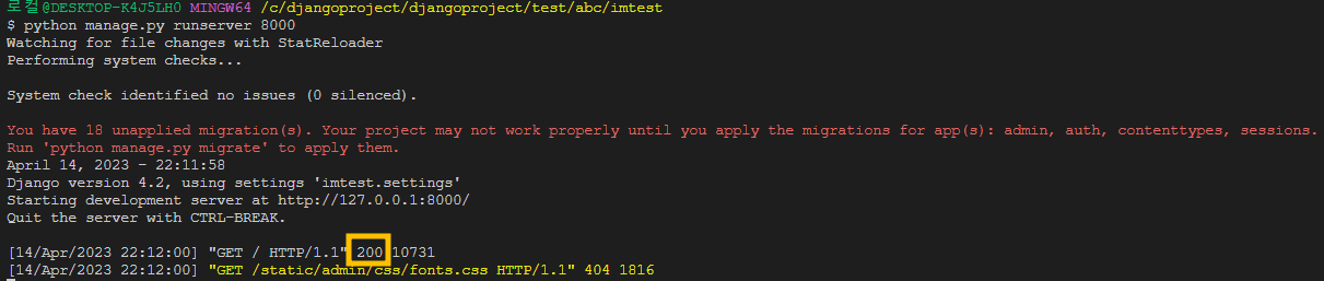 위와 같은 화면이 나오고 응답코드 200이 출력됐다면 서버가 정상적으로 실행된 것이다.
