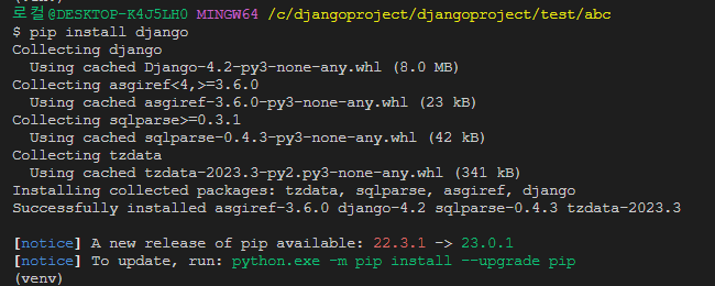 위 명령어를 입력하면 자동적으로 장고를 설치한다