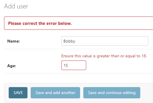 age = models.IntegerField(validators=[MinValueValidator(18), MaxValueValidator(250)])