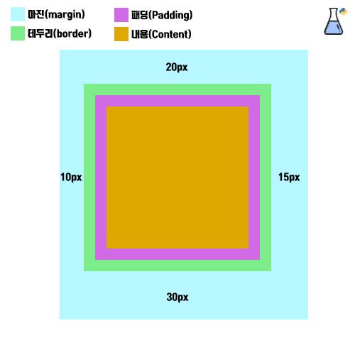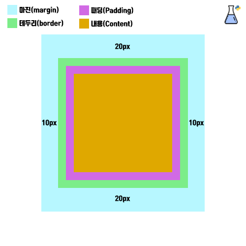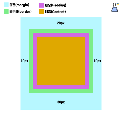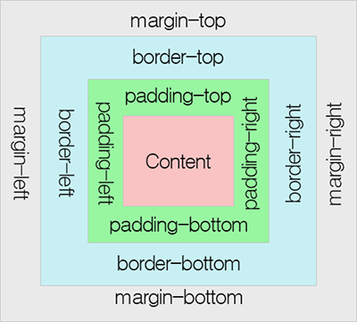 모든 HTMl 요소는 박스 모양으로 구성되며 이것을 박스 모델이라고 부른다. 박스 모델은 가장 바깥부터 다른 이웃하는 요소 사이의 간격을 표현하는 마진(margin), 내용과 패딩을 감싸는 테두리(border), 내용과 테두리 사이의 간격을 표현하는 패딩(padding), 실제 텍스트나 이미지가 들어있는 내용(content)으로 이루어져 있다.