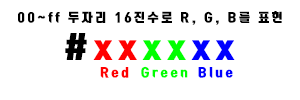 빛의 삼원색(Red, Green, Blue)를 각각 두자리씩 나눠서 0부터 255까지를 16진수로 나타낸다.