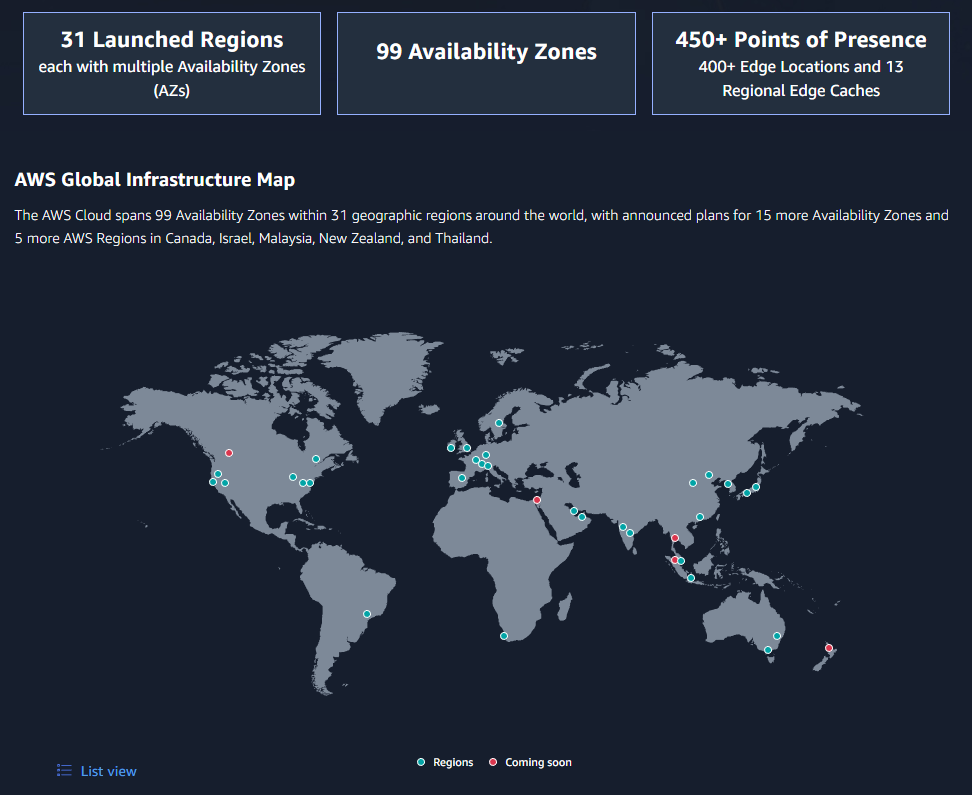 대표적인 클라우드 컴퓨팅 서비스인 AWS는 현재 전세계 31개 지역(Region)에 99개의 AZ를 구축해 운영하고 있다. AZ는 Availability Zone의 줄임말로 한개 이상의 데이터센터의 모음을 구성하는 단위이다. 각 지역의 AZ는 서로 100km 이내에 위치하며 서로 완전히 격리된 독립적인 자체 전원 공급 시스템을 가지고 있다. 따라서 한 곳의 AZ가 문제가 생기더라도 다른 AZ들을 통해 안정적인 서버 운영이 가능하다.
