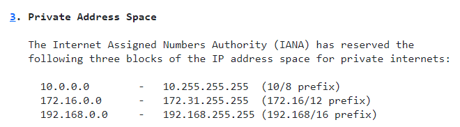 이유는 뭐냐면 RFC 1918에서 지정해 놓은 내부용 IP 범위 이외의 IP를 설정하게 될 경우 외부의 public IP와 겹칠 수가 있다. 그런 일이 발생하게 되면 외부의 public IP로 접속하기 위해 IP주소를 입력해도 내부용 private IP로 혼동해 패킷이 밖으로 나가지 못하고 같은 주소를 가진 내부의 IP주소로 접속된다.