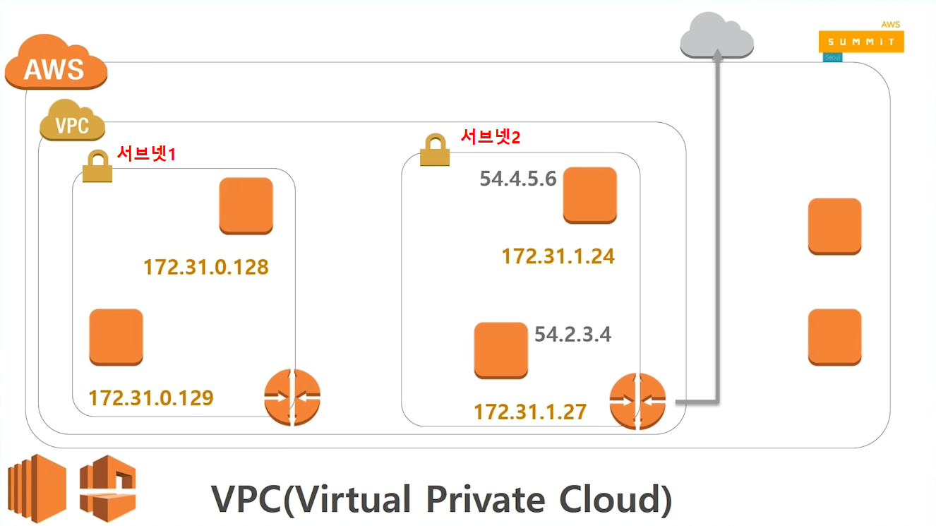 중요한 데이터들을 담고 있는 데이터베이스같이 외부로 유출되면 안되는 서버들의 경우에는 서브넷1처럼 VPC 내부에서만 사내IP처럼 이용할 수 있도록 할 수 있고, 외부와 통신해야 하는 인스턴스들에는 서브넷2처럼 해당 서브넷에만 통로를 열어줄 수 있다.