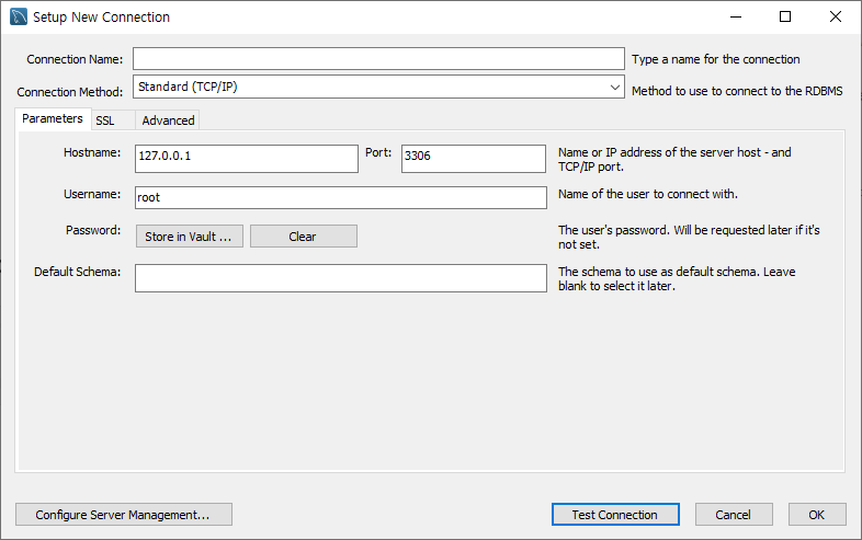 설치완료 후 MySQL Workbench에서 새로운  커넥션을 추가할 때 MySQL 서버 설치했던 정보를 기입하면 MySQL서버에 접속할 수 있다.