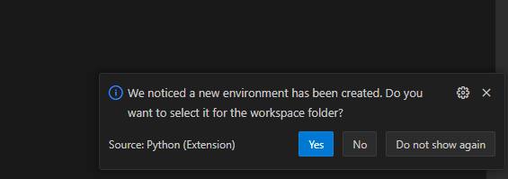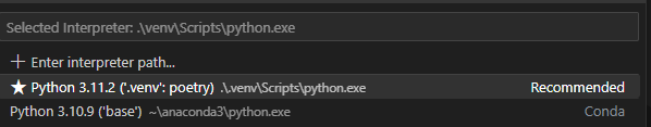 위와 같이 vscode가 poetry 가상환경을 인식한 것을 볼 수 있다. 만약 아직 인식하지 못했다면 Ctrl+Shift+P -> Python: Select Interpreter에서 poetry환경이 있는지 확인해보자