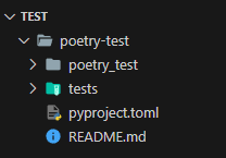 다음과 같이 최상위 폴더 아래 poetry-test라는 이름의 패키지를 위한 프로젝트가 생성되고 의존성 관리를 위한 pyproject.toml 파일과 README.md도 함께 생성된다. 프로젝트를 완성하고 poetry 명령어를 사용해 build하고 publish하면 PyPI에 패키지를 배포할 수 있다