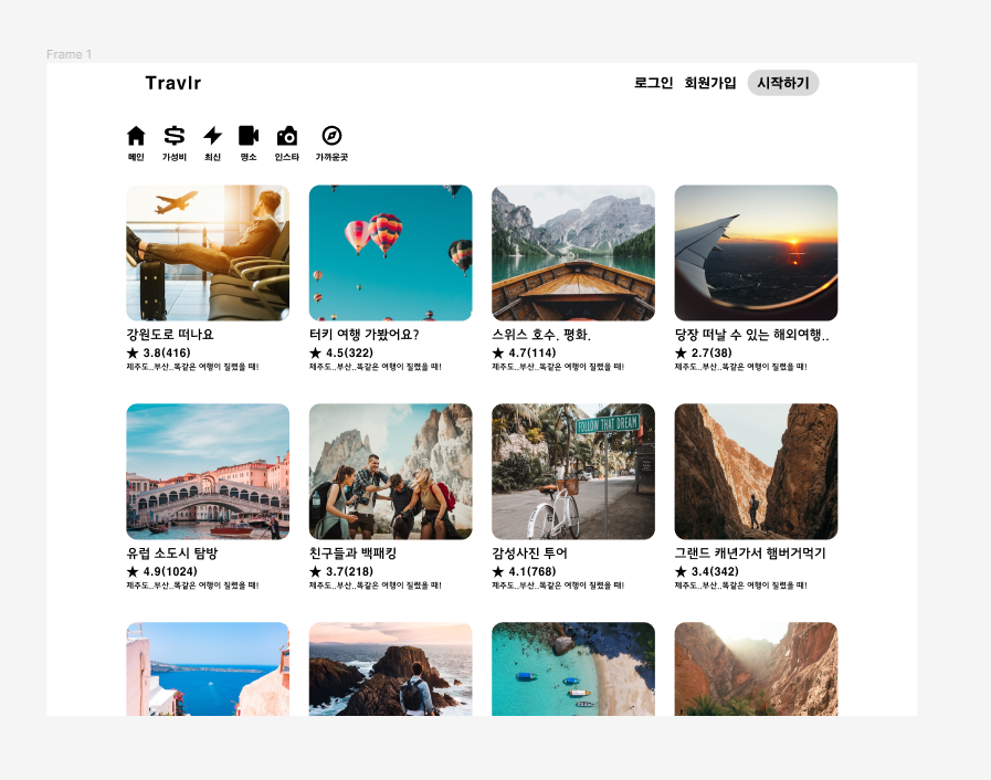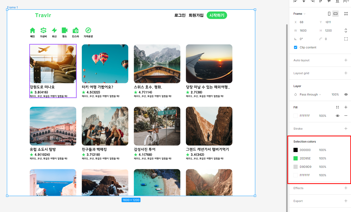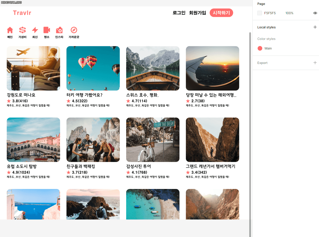 간단하게 샘플 사이트 Travlr의 와이어프레임을 만들었다. 사이트 제목과 버튼, 그리고 카테고리 메뉴, 별에 메인 컬러를 주고 싶다. 근데 아직 메인 컬러를 못 정해서 색을 바꿔가면서 느낌을 보고 싶다. 그럴 땐 컬러 스타일을 지정하면 된다.