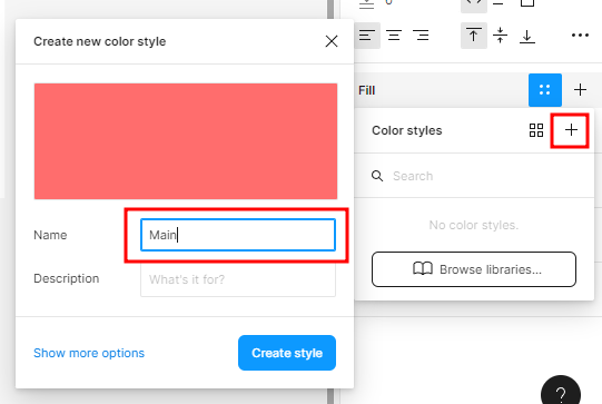 오른쪽과 같은 Color styles 패널이 나타나는데 다시 +버튼을 누르면 왼쪽처럼 Create new color style패널이 뜬다. 우리가 적당히 설정해 준 색의 이름을 정해주는 것이다. 우리는 이 색상을 메인 컬러로 할 것이므로 Main으로 정해줬다.