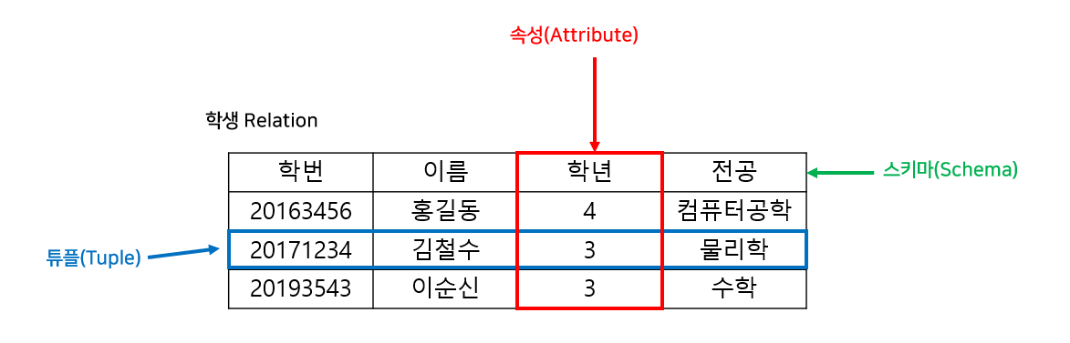 - 스키마(Schema) : 릴레이션의 이름과 릴레이션에 포함된 모든 속성의 이름으로 정의하는 릴레이션의 논리적 구조