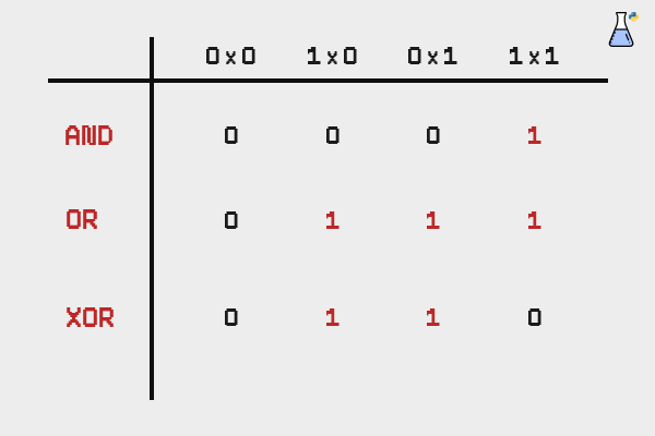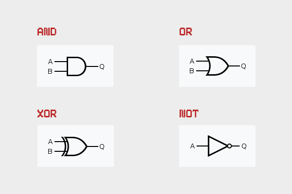 세 가지 기본 부울 연산은 AND, OR, XOR(eXclusive OR, 배타적 논리합)이다. 두 값을 연산해 제3의 결과를 만들어낸다는 점에서 덧셈, 곱셈 등과 비슷하다.