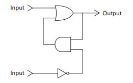 위의 그림은 아주 간단한 플립플롭 회로를 나타낸다. 위의 Input을 A라고 하고 아래를 B라고 하자. 초기에는 A, B에 둘다 어떠한 신호도 주고 있지 않다. 즉 A, B는 둘 다 0이다. 이 상태에서 A에 1을 걸면 A 앞에 있는 OR게이트의 출력값은 1이 된다. 따라서 Output이 1이 된다. 그 다음으로 아래에 있는 AND 게이트를 보자. 아까 OR게이트의 출력값이 다시 AND게이트의 입력값으로 오는데 그 값은 1이었다. 한편 B에서는 0이란 값을 유지하고 있었는데 B 앞의 NOT게이트를 통과하면 출력값이 1이 되고, 결국 AND 게이트의 출력값은 1이 된다. 따라서 OR게이트에서 두번째로 출력하는 값도 1이 된다. 이 상황에서 A의 입력값이 0으로 돌아간다하더라도 아래 AND 게이트에서 계속해서 출력값이 1이므로 Output은 1을 유지하게 된다.