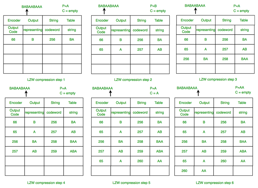 위 그림에서 보다시피 BABAABAAA를 LZW 알고리즘으로 압축해보자. 테이블 왼쪽 열은 압축을 수행하는 Encoder, 오른쪽은 문자 정보가 저장되어 있는 dictionary인 점을 기억하고, B, A까지는 처음 등장하는 개별 문자이므로 유니코드 66, 65를 차례대로 저장하고 이때 발견되는 BA라는 패턴을 256로 저장한다. 다시 AB라는 패턴이 발견되므로 이는 257로 저장한다. 그다음 문자로 넘어갔을 때 우리가 사전에 이미 저장한 BA라는 패턴이 발견됐으므로 66, 65라는 개별적인 인덱스 대신 256이라는 하나의 인덱스로 표현해줄 수 있다.