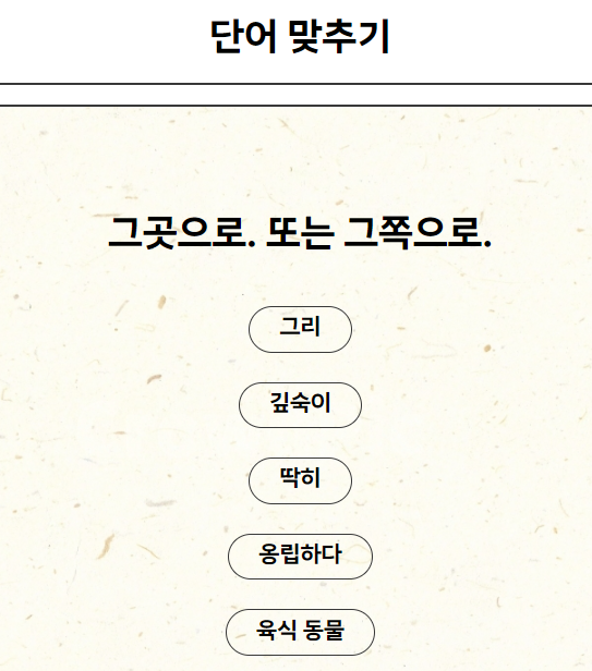초기 계획 중 '퀴즈 유형을 여러 개 만들어서 랜덤으로 제공하자'가 나왔었다. 내가 프론트엔드 초반 구성을 마무리 짓고 퀴즈 생성 기능 개발을 넘겨받았을 때는 크롤링한 네이버 퀴즈와 한국어 사전 api 데이터까지 완성이 된 상태였다. 즉 재료가 준비되어 있었다.