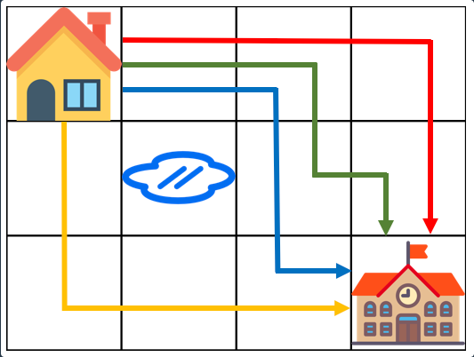 입출력 예제에서 가로로 두번, 세로로 세번 건너는 모든 경우의 수를 센 뒤 웅덩이를 지나는 경우의 수를 빼면 되므로 [가로, 가로, 세로, 세로, 세로]의 경우의 수를 구해주면 된다. 여기서는 가로, 세로 같은 것들이 있으므로 f(5)/f(3).f(2) 즉 같은 것이 있는 순열 공식을 쓰면 된다.