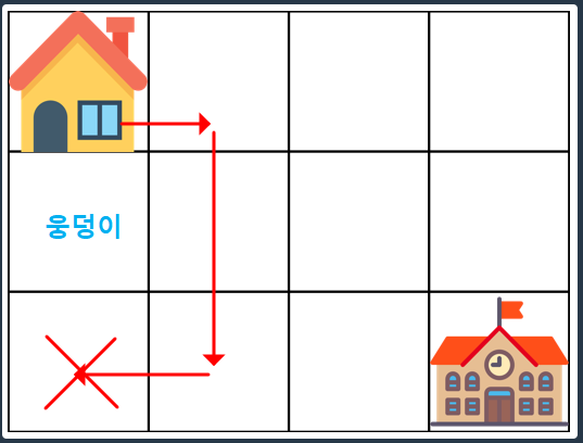 위의 그림처럼 첫 열 중간에 웅덩이가 있다면 그 다음 길도 이용할 수 없다. 따라서 첫 열이나 행일 경우 중간에 웅덩이가 있다면 그 뒤 길까지 전부 0으로 처리해줘야 한다.