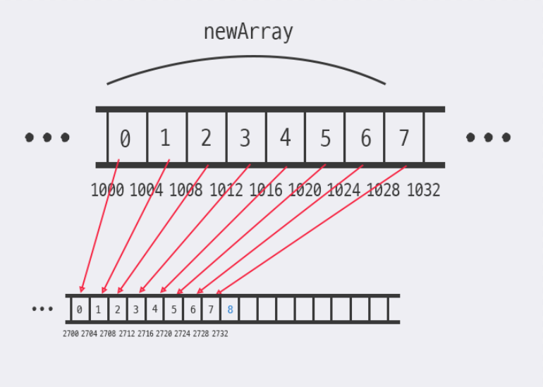 우선 c의 배열은 int newArray[8]; 와 같은 코드를 이용해 임의의 메모리 공간 내에 크기만큼의 연속된 공간을 마련해 놓고 시작한다. newArray배열은 최대 8개의 int형 자료를 채워넣을 수 있다. 만약 8개를 초과하는 자료를 담아야 할 경우에는, 넉넉한 공간을 가진 새로운 배열을 임의의 메모리 공간에 할당하고 기존의 데이터를 똑같이 복사한 후 새로운 자료를 담아주어야 한다. 이제 몇가지 의문점이 생긴다.