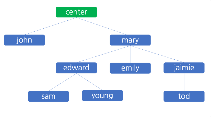 다단계 업체의 수장인 민호의 노드를 만들어준다. 민호는 윗사람이 없으니 None으로 만들어준다.