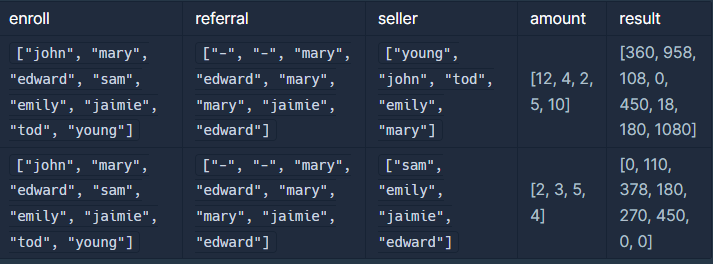 def solution(enroll, referral, seller, amount):