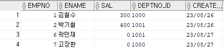 INSERT INTO EMP VALUES (9, '순경민', 600, '1001', sysdate);